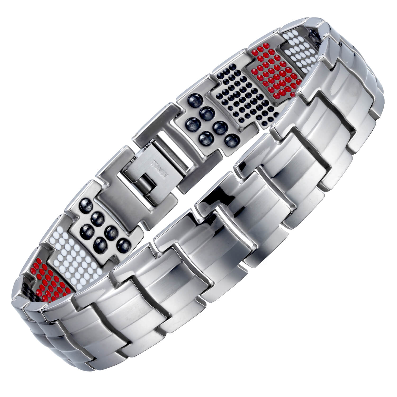 Pulsera de titanio puro de grado aeronáutico, con un diseño circular que integra 12-16 imanes de neodimio (positivos y negativos alternados) alrededor de la banda, asegurando un flujo magnético bipolar óptimo. Disponible en tallas ajustables (16-22 cm) con un cierre magnético invisible para mayor comodidad y seguridad. Su peso ultraligero (apenas 35-50g) la hace ideal para uso prolongado, mientras que el arreglo de imanes promueve un equilibrio biomagnético natural sin interferir en el estilo.