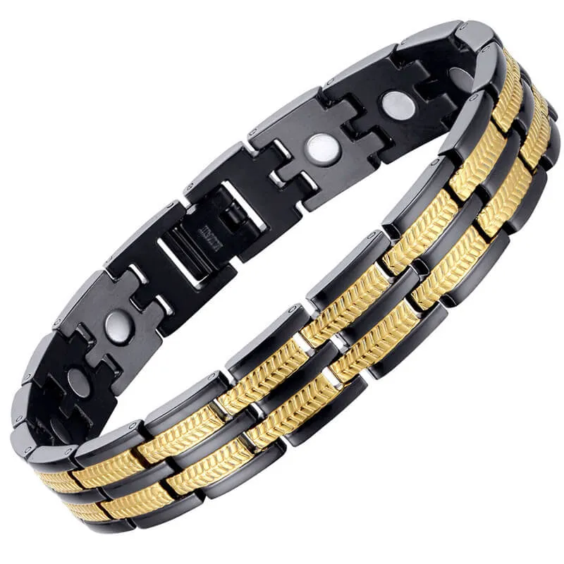 Pulsera de titanio puro de grado aeronáutico, con un diseño circular que integra 38-44 pares de imanes de neodimio (positivos y negativos alternados) alrededor de la banda, asegurando un flujo magnético bipolar óptimo. Disponible en tallas ajustables (16-22 cm) con un cierre magnético invisible para mayor comodidad y seguridad. Su peso ultraligero (apenas 35-50g) la hace ideal para uso prolongado, mientras que el arreglo de imanes promueve un equilibrio biomagnético natural sin interferir en el estilo.