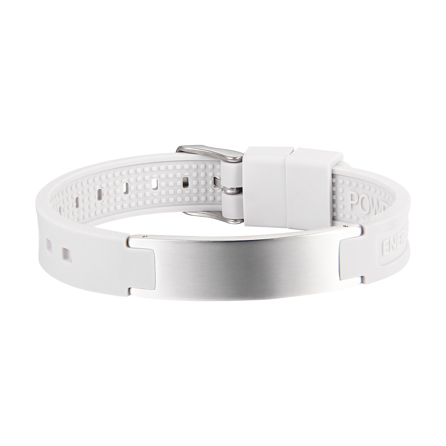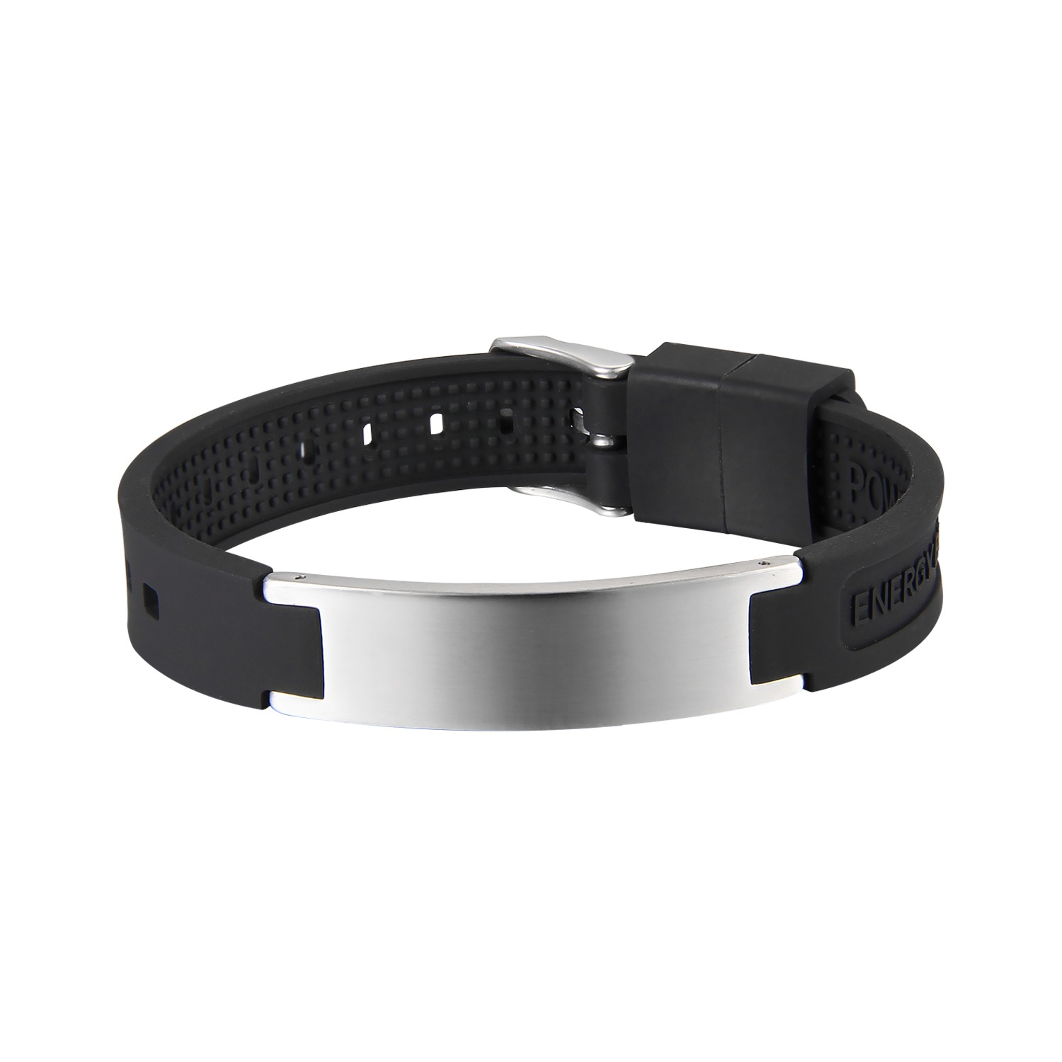 pulsera flexible y ajustable hecha de silicona hipoalergénica de grado médico, con una placa central de acero inoxidable lisa (aprox. 2x1 cm) diseñada para personalización láser profesional. Incluye 4 imanes de neodimio (2 positivos y 2 negativos) colocados estratégicamente alrededor de la banda para un equilibrio bipolar óptimo. Disponible en tallas universales (15-25 cm, extensible) y colores variados como negro, azul, gris o rojo, con opción de grabado láser incluido en la compra para añadir nombres, símbolos o detalles personalizados.